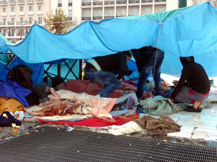 Την ίδια στιγμή, προβλήματα προκαλεί η βροχή και στους Σύρους πρόσφυγες που παραμένουν στην πλατεία Συντάγματος.