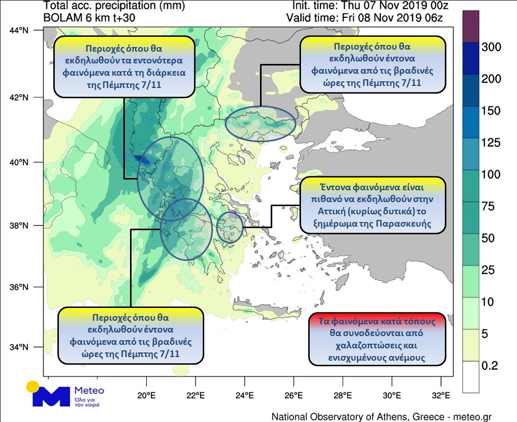 Τις νυχτερινές ώρες της Πέμπτης και προς το ξημέρωμα της Παρασκευής τα έντονα καιρικά φαινόμενα θα μετατοπιστούν ανατολικότερα και θα επηρεάσουν τη Θεσσαλία, τη Στερεά Ελλάδα, την υπόλοιπη Πελοπόννησο και την κεντρική – ανατολική Μακεδονία. Ενδέχεται οι βροχές που θα εκδηλωθούν στη βορειοανατολική Πελοπόννησο, στην κεντρική – ανατολική Στερεά Ελλάδα / Εύβοια προς το ξημέρωμα της Παρασκευής να έχουν ιδιαίτερα αυξημένη ένταση και να συνοδεύονται από χαλαζοπτώσεις και έντονη ηλεκτρική δραστηριότητα.