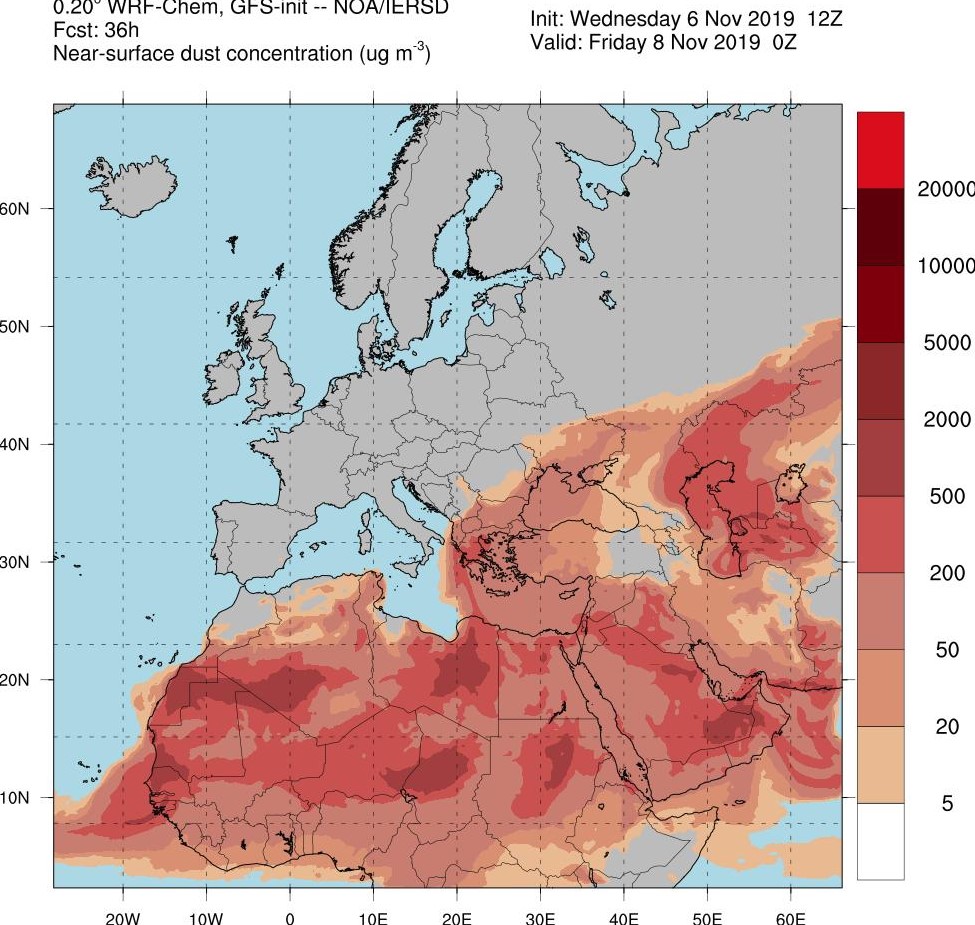 Στον παρακάτω χάρτη μπορείτε να παρατηρήσετε τη μεταφορά σημαντικών ποσοτήτων σκόνης: