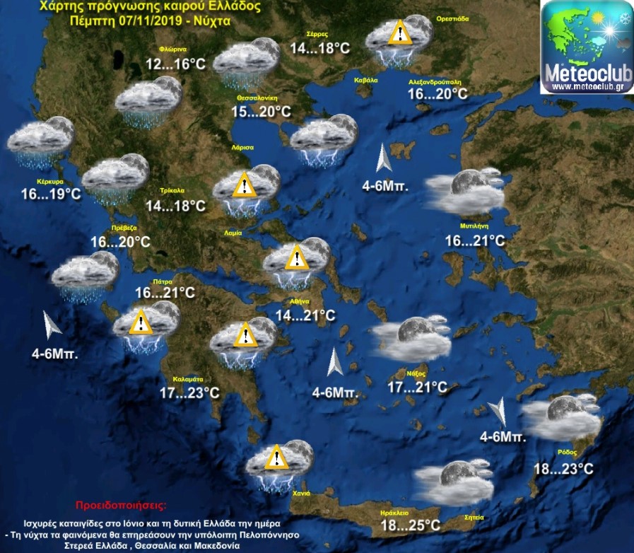 Κατά τη διάρκεια της νύχτας της Πέμπτης προς Παρασκευή, βροχές και καταιγίδες θα εκδηλωθούν σε πολλές περιοχές της ηπειρωτικής χώρας, στις Σποράδες και στα νησιά του βορείου Αιγαίου. Τα φαινόμενα θα είναι τοπικά έντονα και σε ορισμένες περιπτώσεις θα συνοδευτούν από χαλαζοπτώσεις και πολύ ενισχυμένους ριπαίους ανέμους.