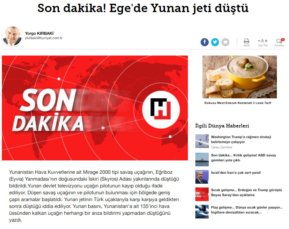 Η τουρκική «Hürriyet» μετέδωσε την είδηση, επικαλούμενη το έκτακτο δελτίο ειδήσεων της ΕΡΤ, αναφέροντας ότι αγνοείται ο πιλότος του μαχητικού αεροσκάφους.
