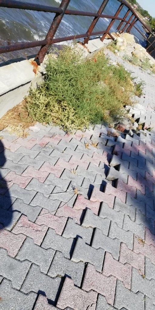 Όπως βλέπετε στις φωτογραφίες το πλακόστρωτο του πεζοδρομίου σε πολλά σημεία έχει καταρρεύσει, γεμίζοντας μπάζα τη θάλασσα και τα κιγκλιδώματα είναι σκουριασμένα.
