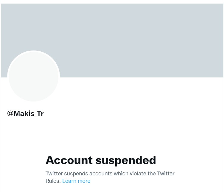 Δεν υπήρξε απολύτως καμία προειδοποίηση προηγουμένως για τις προθέσεις του συγκεκριμένου κοινωνικού δικτύου, ούτε μπορεί να περάσει από το μυαλό μας ποια είναι η πραγματική αιτία για την οποία το Twitter προχώρησε σε αναστολή του λογαριασμού. Δείτε το print screen με την ειδοποίηση περί αναστολής του λογαριασμού του Μάκη Τριανταφυλλόπουλου: