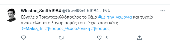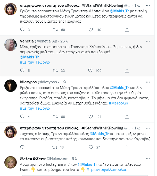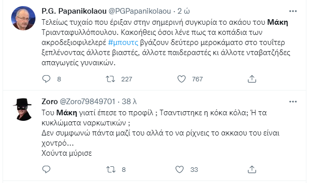 Ένα από τα τελευταία tweets του Μάκη ήταν και το εξής: «#γιατι_στον_Τριανταφυλλοπουλο Να σας πω εγώ γιατί: Γιατί δεν θα είχατε τα.@…@ να αναδείξετε ούτε τα μισά από όσα είπε η Γεωργία. Γιατί είσαστε αρπακτικά αιμοβόρα. Γιατί είσαστε υπάλληλοι και υπηρέτες! Γιατί είσαστε #λεβέντες_χέστες! Γι’ αυτό μη ρωτάτε ένα «γιατί» που γνωρίζετε!».