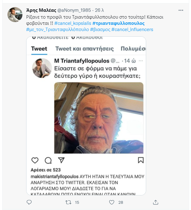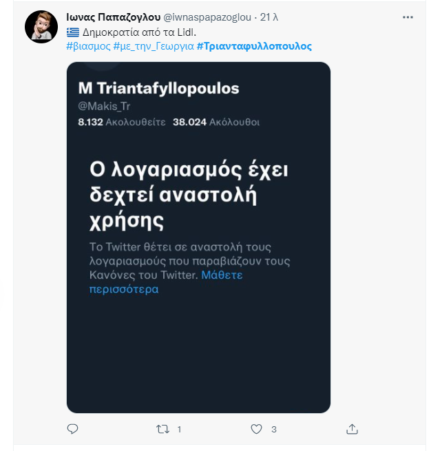Είναι προφανές πως το Twitter οφείλει εξηγήσεις καθώς και λεπτομερή αναφορά στους λόγους για τους οποίους προχώρησε σε αναστολή λειτουργίας του λογαριασμού του Μάκη Τριανταφυλλόπουλου.