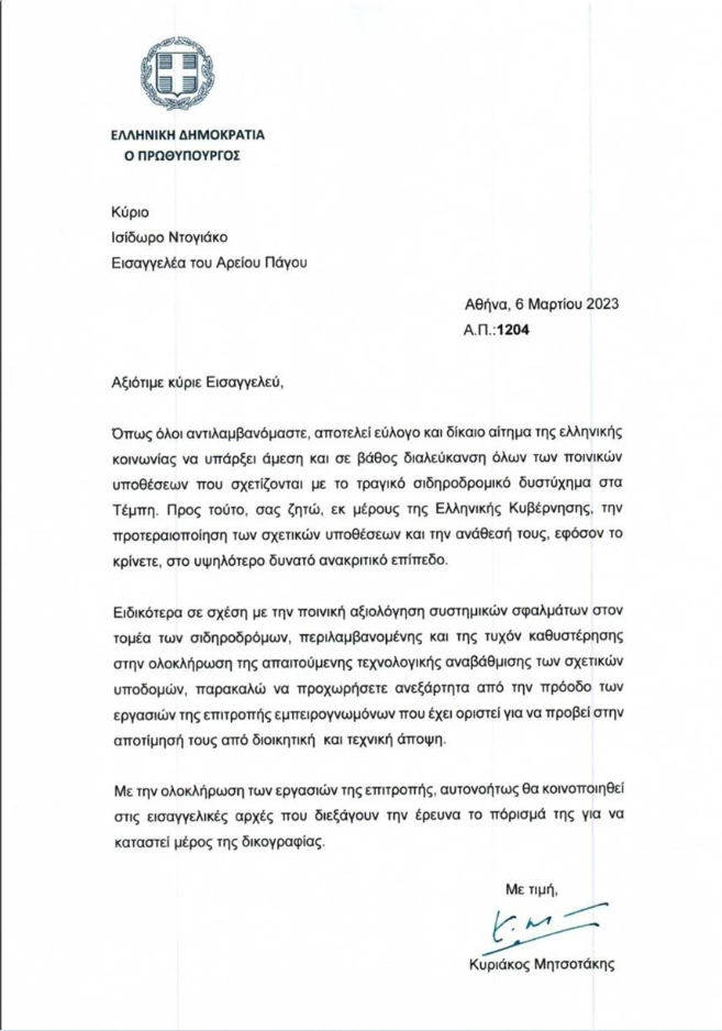 Με επιστολή του ο Κυριάκος Μητσοτάκης ζητά από τον εισαγγελέα του Αρείου Πάγου, Ισίδωρο Ντογιάκο, «να δοθεί προτεραιότητα στην έρευνα και στην ανάθεση σε ανακριτή» για τις ποινικές υποθέσεις που σχετίζονται με το τραγικό δυστύχημα στα Τέμπη.