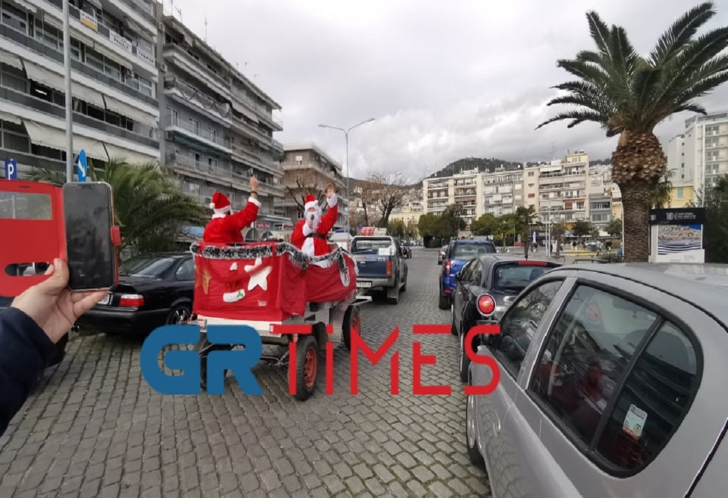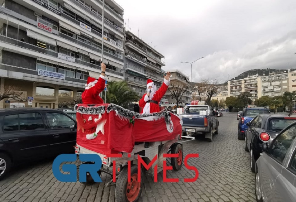 «Χρόνια πολλά, καλή χρονιά» φώναζαν επάνω από το έλκηθρο το οποίο έπαιζε παράλληλα χριστουγεννιάτικα κάλαντα ενώ μοίρασαν και λιχουδιές σε παιδιά.