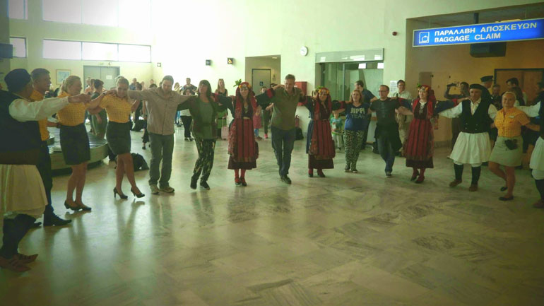 Στον χώρο αναμονής για την παραλαβή των αποσκευών τους είχε στηθεί μπουφές με τοπικά παραδοσιακά εδέσματα, όπως γλυκά, λάδι, ελιές, πετιμέζι και κρασιά, ενώ ακολούθησε χορός με παραδοσιακούς ήχους αλλά και το παγκοσμίως γνωστό συρτάκι, στο οποίο συμμετείχαν με μεγάλη χαρά οι τουρίστες.