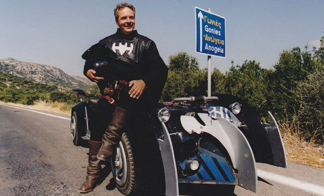 Οι Κρητικοί τον αποκαλούν Batmanάκη αφού κυκλοφορεί όπως ο γνωστός ήρωας με το Batmobile, που ο ίδιος έχει κατασκευάσει! Η… πραγματική του ιδιότητα είναι φυσικοθεραπευτής στο ΚΑΠΗ του Δήμου Ανωγείων.
