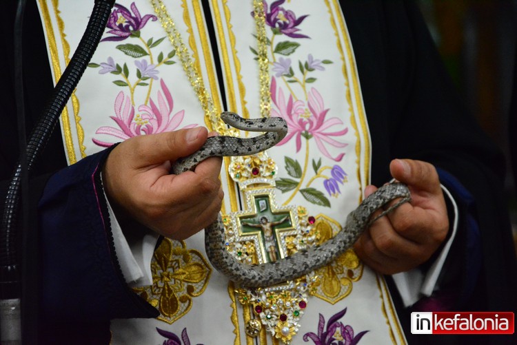 Για άλλη μία χρονιά, ο Εσπερινός συγκέντρωσε πλήθος πιστών που ήθελαν να δουν από κοντά, να αγγίξουν και να φωτογραφίσουν τα άκακα Φιδάκια της Παναγίας, τα οποία φέρουν σταυρό στο κεφάλι.