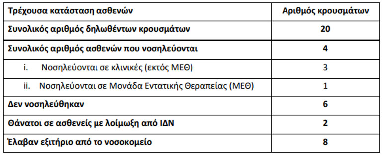 Πίνακας 2. Τρέχουσα κατάσταση ασθενών με εργαστηριακή διάγνωση λοίμωξης από ιό Δυτικού Νείλου, 2017, έως 09/08/2017 (ώρα 12.00)