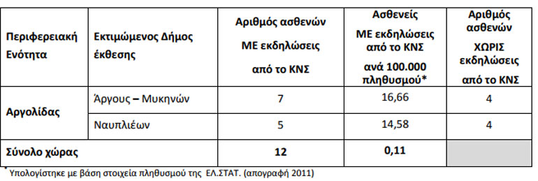 Στην εβδομαδιαία 9/8/2017 αναφορά του ΚΕΕΛΠΝΟ που σκοπό έχει τη συνοπτική παρουσίαση των κρουσμάτων που διαγιγνώσκονται εργαστηριακά με λοίμωξη από τον ιό του Δυτικού Νείλου (ΔΝ), τα κρούσματα στην Αργολίδα αυξήθηκαν στα 20.