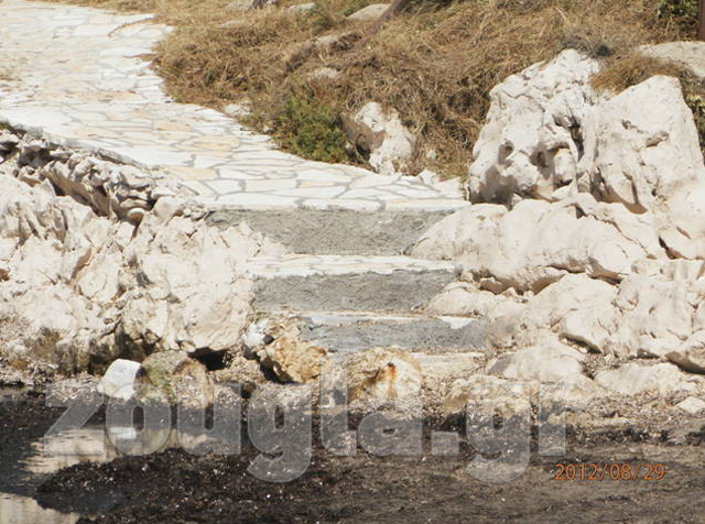 Συγκεκριμένα, έριξε μπετόν, μπάζωσε μεγάλο μέρος της παραλίας και δημιούργησε δρόμο, ώστε να είναι δυνατή η διέλευση φορτηγών καθαρισμού, ενώ παράλληλα κατήργησε τη νόμιμη φυσική οδό, με την αιτιολογία ότι περνάει μέσα από το κτήμα του (παραλία).