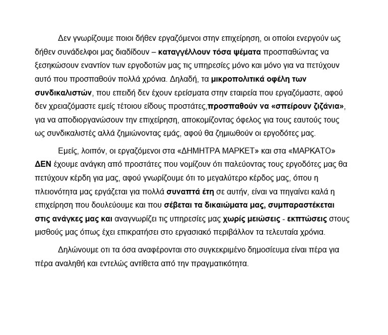 ΑΝΑΚΟΙΝΩΣΗ – ΑΠΑΝΤΗΣΗ ΕΡΓΑΖΟΜΕΝΩΝ ΔΗΜΗΤΡΑ ΜΑΡΚΕΤ