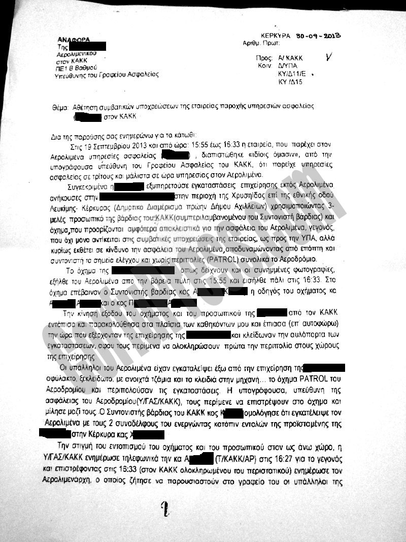 Σύμφωνα με το πολυσέλιδο έγγραφο που απέστειλε ο αερολιμενάρχης Α. Γεωργούσης στην κεντρική διοίκηση της ΥΠΑ (το οποίο συνετάχθη από την προϊστάμενη του τμήματος ασφαλείας του αεροδρομίου), εργαζόμενοι της συγκεκριμένης εταιρείας «πιάστηκαν στα πράσα» από την προϊστάμενη του Γραφείου Ασφαλείας του αεροδρομίου να φεύγουν από τη βάρδια τους για να παράσχουν υπηρεσίες σε τρίτους και, συγκεκριμένα, σε επιχείρηση στην περιοχή της Χρυσηίδας!
