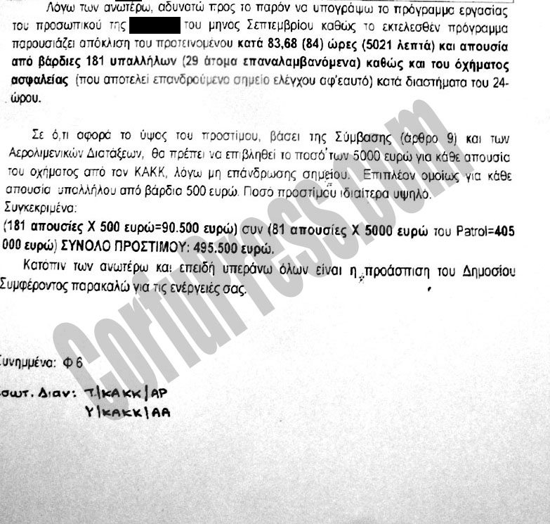 Αναφέρεται χαρακτηριστικά στο έγγραφο της ΥΠΑ: «Η εταιρεία απαντώντας εμπρόθεσμα εντός πέντε ημερών ομολόγησε ότι χρησιμοποιούσε προσωπικό και το όχημα ασφαλείας του Κ.Α.Κ.Κ. με την ευφάνταστη δικαιολογία ότι αυτή η δραστηριότητα αύξανε την ασφάλεια στην ευρύτερη περιοχή του αερολιμένα, ισχυρισμός που εκτός του ότι επιχειρεί να μειώσει τη νοημοσύνη μας, δεν πείθει κανέναν. Η αστυνόμευση της περιοχής είναι ευθύνη της Ελληνικής Αστυνομίας και όχι του προσωπικού του Κ.Α.Α.Κ.».