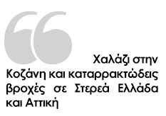 Σε όλη την επικράτεια παρατηρούνται επικίνδυνα καιρικά φαινόμενα που συνοδεύονται από χαλαζοπτώσεις και ενισχυμένους ανέμους, με αποτέλεσμα να δημιουργηθούν μεταξύ άλλων προβλήματα στην κυκλοφορία των οχημάτων. Στην Αττική σε ποτάμια μετατράπηκαν μέσα σε λίγα λεπτά κεντρικοί δρόμοι των βορείων προαστίων αλλά και του Πειραιά.