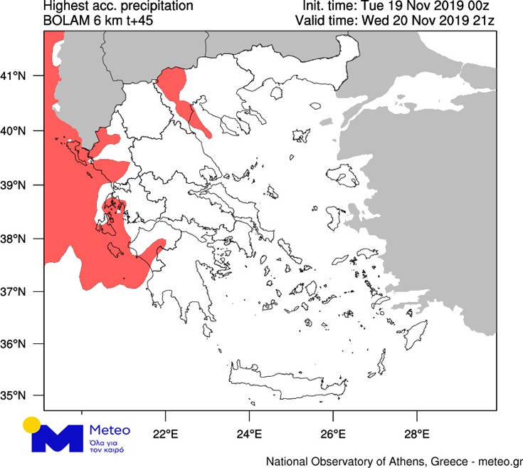 Την Τετάρτη προβλέπονται βροχές στα νησιά του Ιονίου, στην Ήπειρο, στη δυτική Στερεά και στη δυτική Πελοπόννησο. Εξασθένηση των φαινομένων αναμένεται από τα βορειοδυτικά μετά το μεσημέρι.
