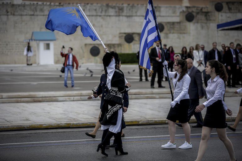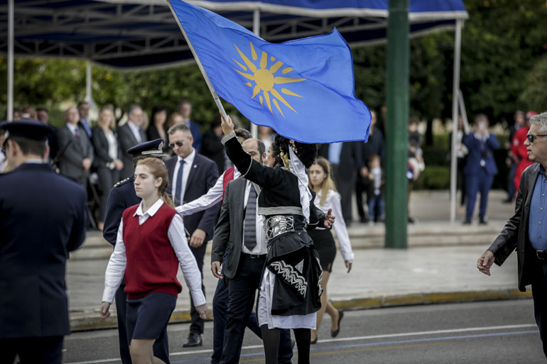 Κατά τη διάρκεια της παρέλασης ένας άνδρας και μία γυναίκα, ντυμένοι με παραδοσιακές φορεσιές, κρατώντας σημαίες, η μία με τον ήλιο της Βεργίνας, παρεισέφρησαν ανάμεσα στα σχολεία και παρέλασαν, σταματώντας μπροστά από την εξέδρα των επισήμων και φωνάζοντας συνθήματα.