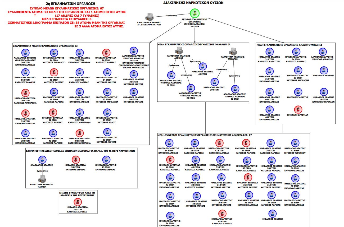 H εν λόγω εγκληματική οργάνωση αποτελούνταν από 67 (!) τουλάχιστον μέλη -60 άνδρες και 7 γυναίκες-, που δραστηριοποιούνταν στη διακίνηση ναρκωτικών ανά την ελληνική επικράτεια.