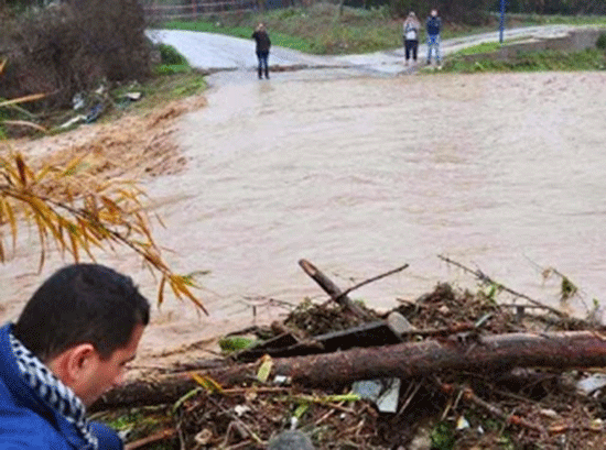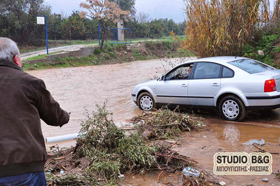 Λόγω της δυνατής βροχής που πέφτει από την νύχτα το ρέμα Ραμαντάνι που ξεκινά από την ορεινή Αργολίδα και καταλήγει στο Ναύπλιο έχει φουσκώσει με αποτέλεσμα να έχει κλείσει η κυκλοφορία σε πολλούς επαρχιακούς δρόμους, Παρασκευή 27 Δεκεμβρίου 2013.