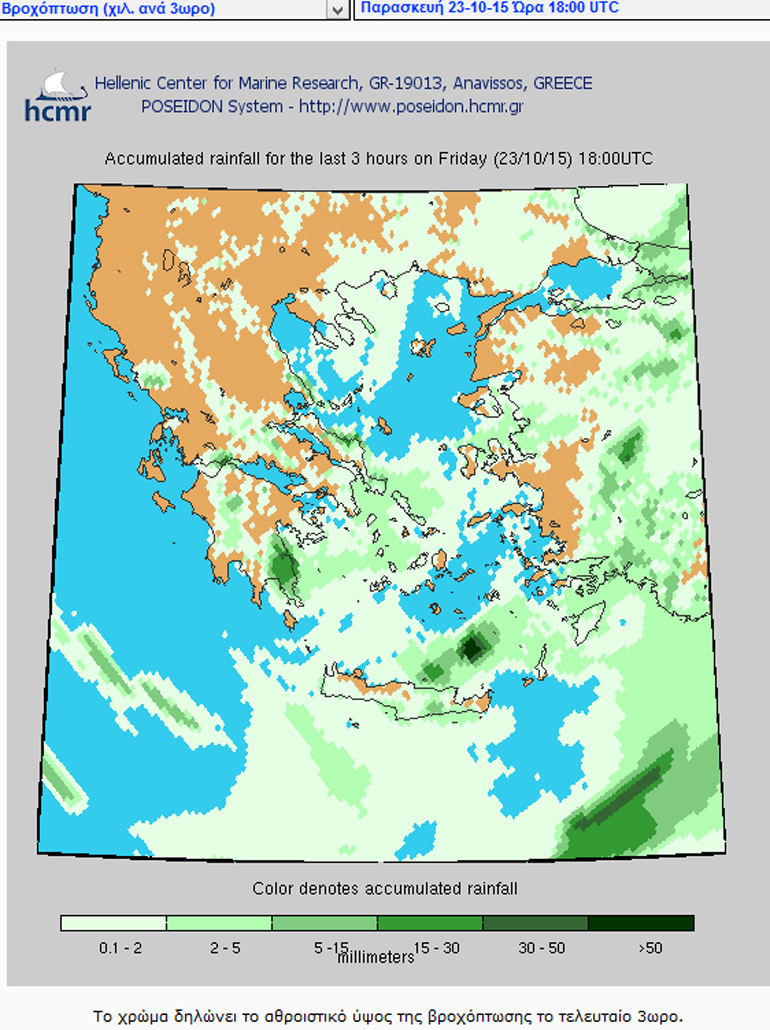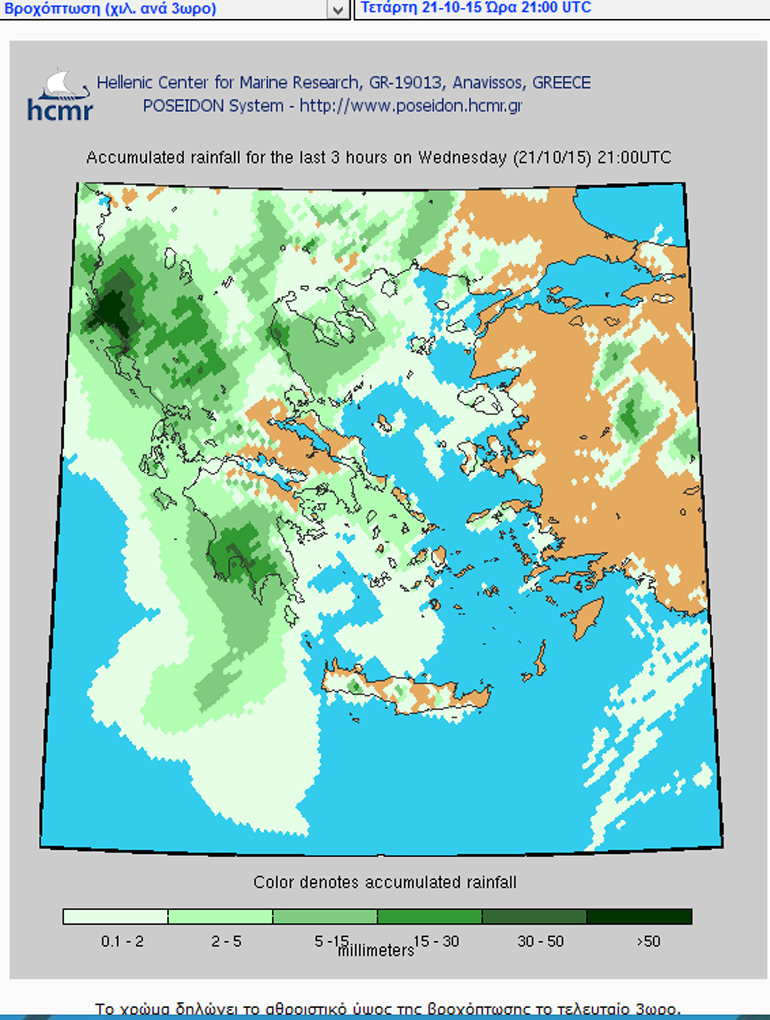Βροχές και καταιγίδες προβλέπονται για την Τετάρτη (21-10-2015) στο μεγαλύτερο μέρος της χώρας οι οποίες θα είναι καταιγίδες περιόδους τοπικά ισχυρές αρχικά στη δυτικη Ελλάδα και βαθμιαία μέχρι το τέλος της ημέρας και στις υπόλοιπες περιοχές.