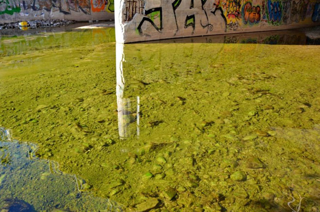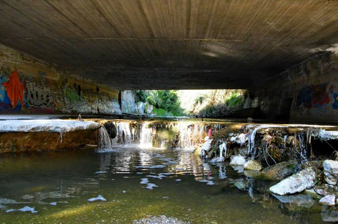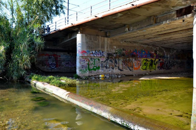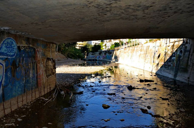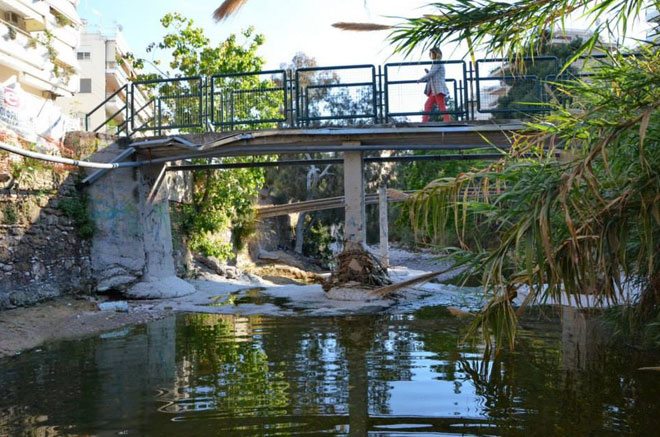 Πράσινο νερό, μεταλλικοί και λαστιχένιοι σωλήνες κρυμμένοι ή περίβλεπτοι επί της κοίτης, παντού και από παντού, βιοποικιλότητα σε κίνδυνο είναι η εικόνα που βλέπουμε στο Ρέμα Πικροδάφνης στο Παλαιό Φάληρο.