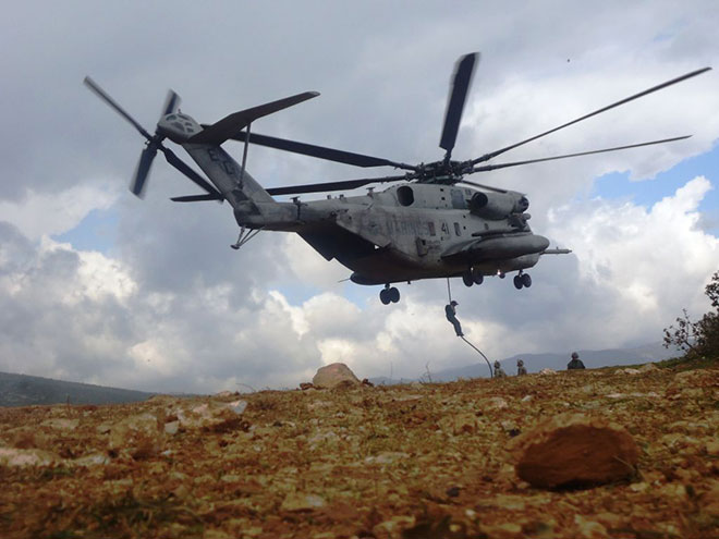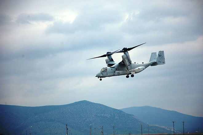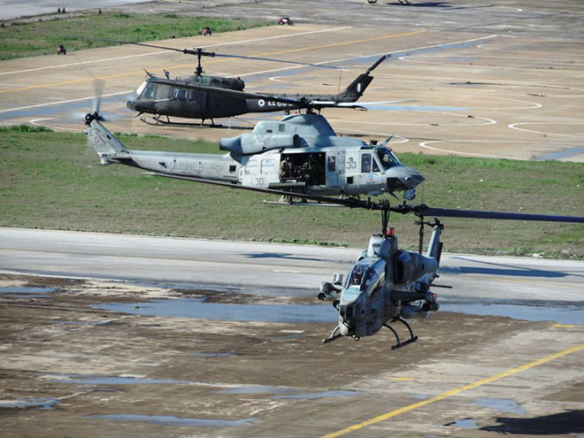 Στους αιθέρες βρέθηκαν επίσης τα αμερικανικά ελικόπτερα Σικόρσκυ CH-53, τα ιδιαίτερα εντυπωσιακά για τις επιχειρησιακές τους δυνατότητες ελικοφόρα κάθετης απογείωσης V-22 OSPREY αλλά και ελικόπτερα Χιούι.