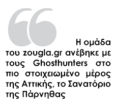 Η ομάδα του zougla.gr ανέβηκε με τους Ghosthunters στο πιο στοιχειωμένο μέρος της Αττικής, το Σανατόριο της Πάρνηθας, όπου οι μύθοι και οι θρύλοι κάνουν λόγο για ανεξήγητα φαινόμενα και… βασανισμένες ψυχές, που τριγυρνούν ακόμα στο εγκαταλελειμμένο επιβλητικό ερείπιο του παλιού νοσοκομείου, που αργότερα μετατράπηκε σε «Ξενία», για να αφεθεί να ρημάζει οριστικά τα τελευταία 30 χρόνια…