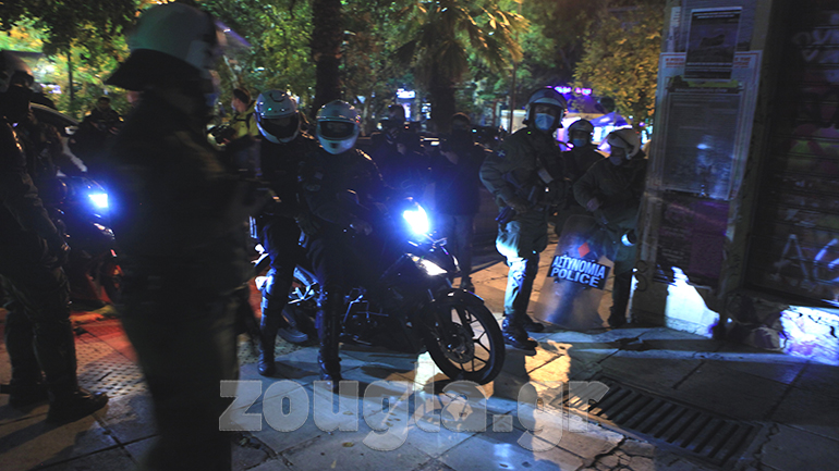 Άνδρες των ΜΑΤ κυνήγησαν συγκεντρωμένους στους δρόμους των Εξαρχείων, κοντά στο μνημείο του Αλέξανδρου Γρηγορόπουλου, στη συμβολή των οδών Τζαβέλα και Μεσολογγίου, το απόγευμα της Δευτέρας.