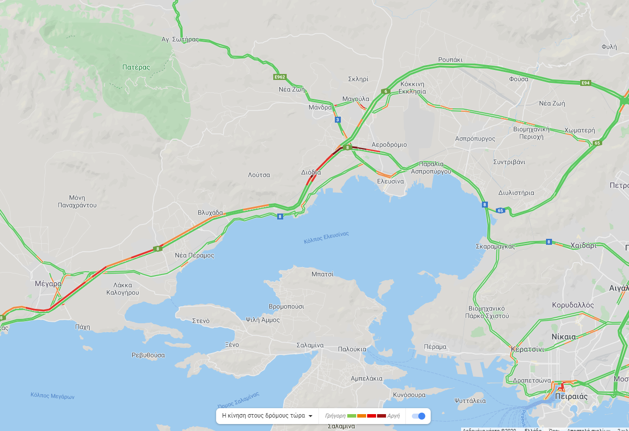 Η έντονη συμφόρηση των οδικών δικτύων αρχίζει από το ύψος των διυλιστηρίων ενώ στα διόδια της Ελευσίνας τα οχήματα σχηματίζουν ουρές.