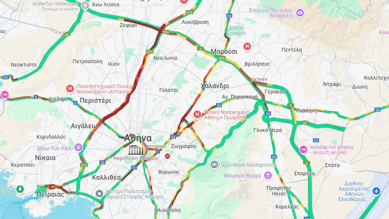 Παράλληλα, με χαμηλές ταχύτητες κινούνται τα οχήματα και στην Κηφισίας τόσο στην άνοδο όσο και στην κάθοδο από το Ψυχικό έως το Μαρούσι ενώ κίνηση σημειώνεται και στο κέντρο της πόλης.