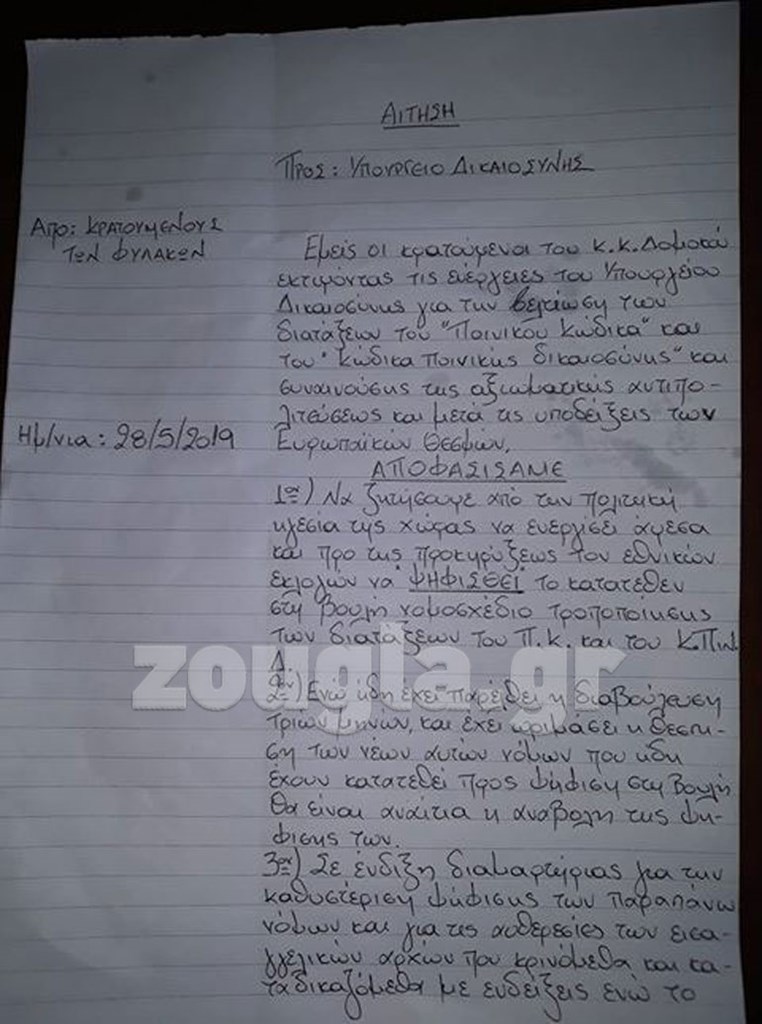 Οι κρατούμενοι στις φυλακές Δομοκού ζητούν από την πολιτική ηγεσία της χώρας να ενεργήσει άμεσα και πριν από την προκήρυξη εθνικών εκλογών να προβεί στην ψήφιση του νομοσχεδίου τροποποίησης των διατάξεων του Ποινικού Κώδικα και του Κώδικα Ποινικής Δικονομίας.