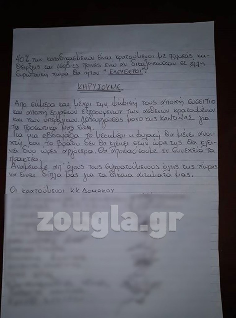 Παράλληλα, ζητούν από τους συγκρατουμένους τους σε όλα τα σωφρονιστικά ιδρύματα της χώρας να σταθούν δίπλα τους και να στηρίξουν τα αιτήματά τους.