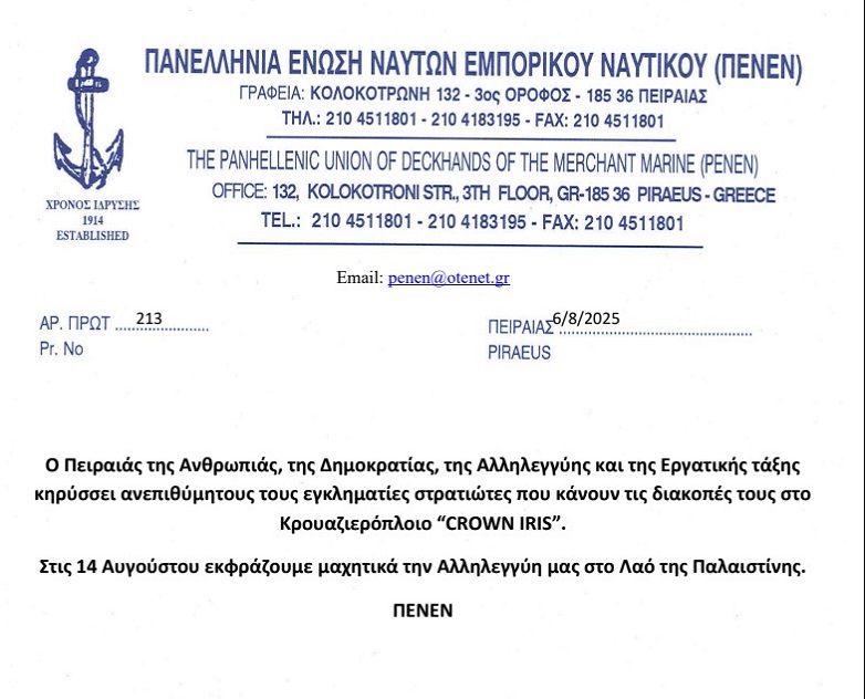 Με ανακοίνωσή της η Πανελλήνια Ένωση Ναυτών Εμπορικού Ναυτικού (ΠΕΝΕΝ) προαναγγέλλει κινητοποίηση αλληλεγγύης στον παλαιστινιακό λαό στις 14 Αυγούστου στο λιμάνι του Πειραιά.