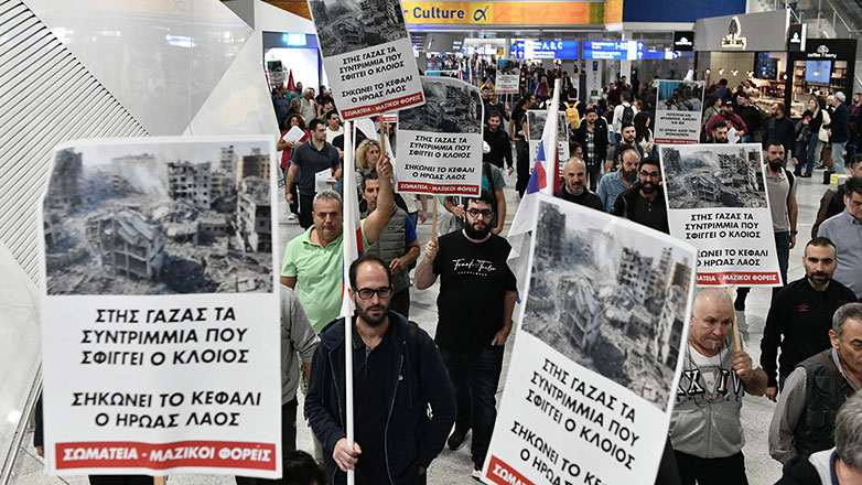 Κινητοποίηση μέσα στο χώρο των αναχωρήσεων του αεροδρομίου «Ελ. Βενιζέλος» πραγματοποίησαν σήμερα συνδικάτα και μαζικοί φορείς που πρόσκεινται στο ΠΑΜΕ.