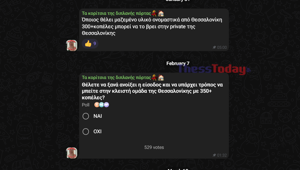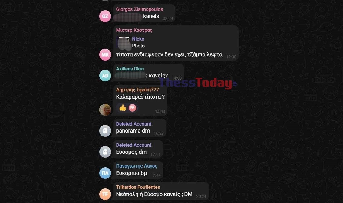 Σύμφωνα με πληροφορίες, τις τελευταίες ώρες έχουν γίνει ανεπίσημες καταγγελίες τηλεφωνικά αλλά και μέσω email στην Δίωξη Ηλεκτρονικού Εγκλήματος, από γυναίκες που αντιλήφθηκαν πως διακινούνται προσωπικές τους φωτογραφίες και βίντεο μέσω της συγκεκριμένης ομάδας. Επίσης, όπως είναι σε θέση να γνωρίζει το ThessToday.gr, γυναίκες-θύματα επικοινωνούν μεταξύ τους μέσω των social media, προκειμένου να προχωρήσουν μαζί σε σχετικές καταγγελίες.