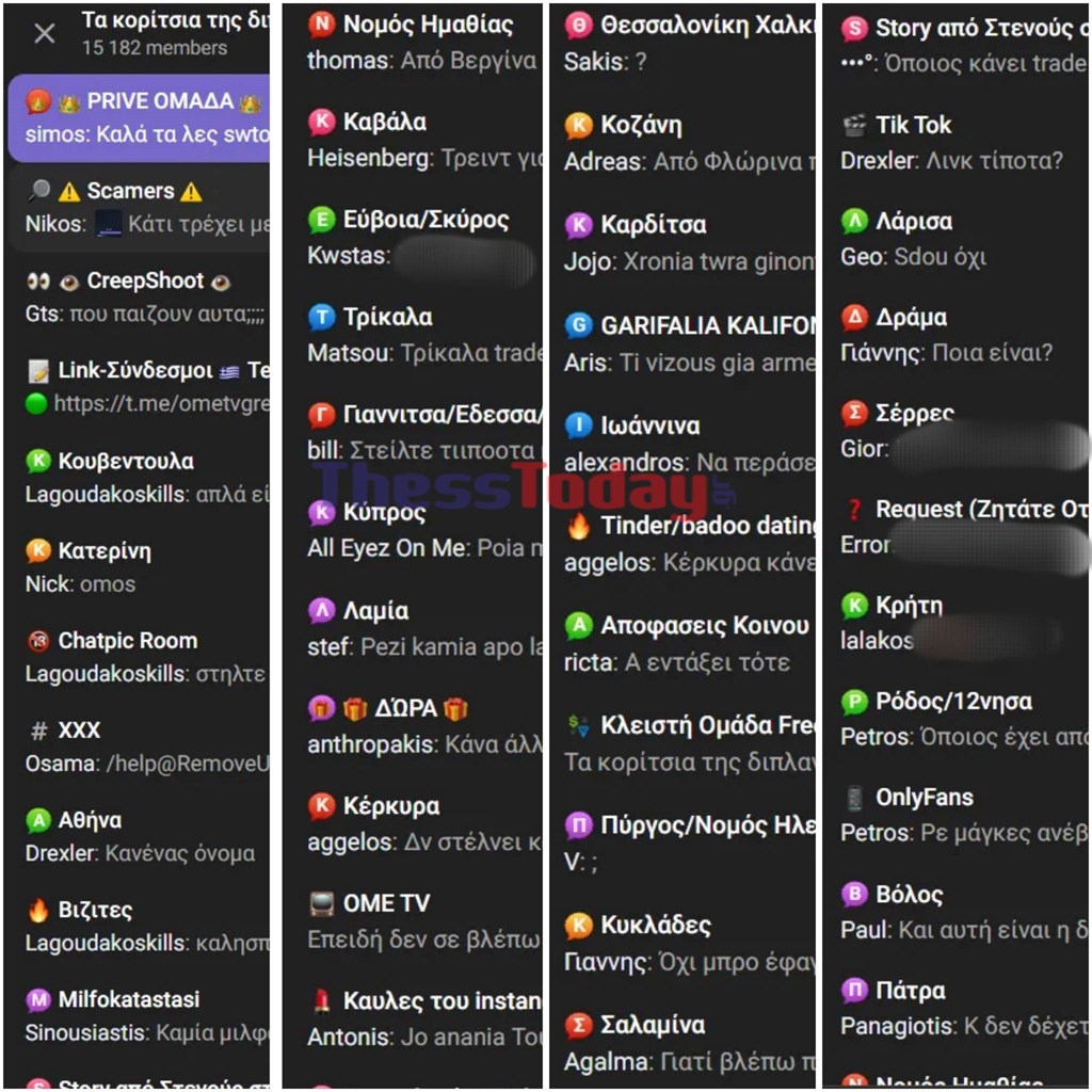 Όπως μπορείτε να δείτε στις φωτογραφίες, υπάρχουν πάνω από 20 υπό-ομάδες για διάφορες πόλεις της Ελλάδας όπως και ομάδα για την Κύπρο, στις οποίες οι χρήστες δίνουν το ονοματεπώνυμο της κοπέλας που αναζητούν, όπως και το profile στα social media και στη συνέχεια περιμένουν κάποιον άλλον να ανταποκριθεί, ο οποίος θα διαθέτει και θα μοιράσει σε όλους το φωτογραφικό ή βιντεοληπτικό υλικό, παραβιάζοντας κάθε έννοια των προσωπικών δεδομένων αυτών των γυναικών κι όχι μόνο. Σαν να μην έφταναν όλα αυτά, σε διάφορες άλλες συνομιλίες μοιράζονται φωτογραφίες ανυποψίαστων γυναικών, τις οποίες έχουν τραβήξει χωρίς να γίνουν αντιληπτοί, όπως και ανταλλάσσουν διάφορα stories γυναικών από το Instagram και το Tik Tok, με μοναδικό στόχο να βρουν περαιτέρω υλικό.