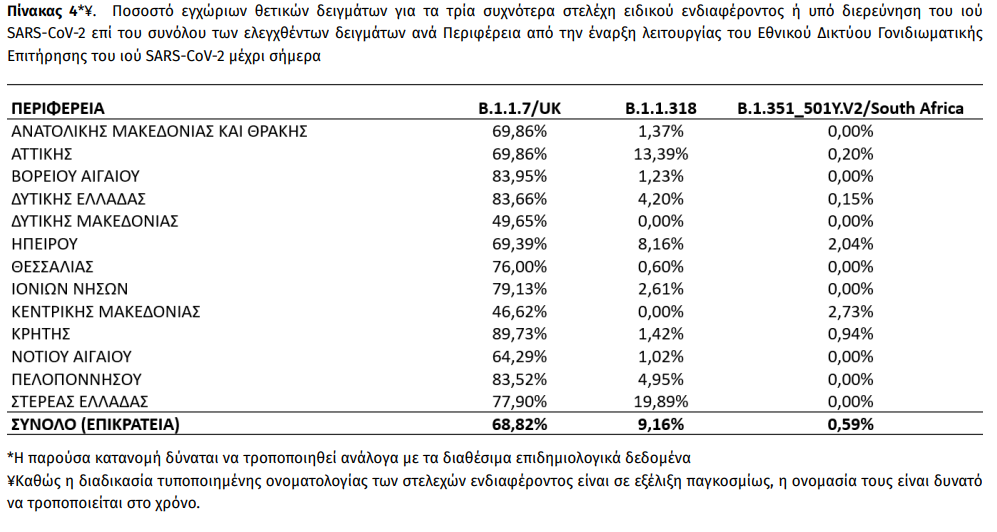Από την έναρξη λειτουργίας του Εθνικού Δικτύου Γονιδιωματικής Επιτήρησης του ιού SARS-CoV-2 μέχρι σήμερα έχουν ελεγχθεί στην επικράτεια συνολικά 13.289 δείγματα από εγχώρια κρούσματα, εκ των οποίων τα τρία πιο συχνά στελέχη ειδικού ενδιαφέροντος ή υπό διερεύνηση που έχουν απομονωθεί είναι το Β.1.1.7/UK lineage (Variant VOC 202012/01), με ποσοστό 68,82%, ακολουθούμενο από το B.1.1.318 (Variant E484K) με ποσοστό 9,16% και το B.1.351/501Y.V2/South Africa (Variant VOC 202012/02) με ποσοστό 0,59% (Πίνακας 4). Επιπλέον, έχουν απομονωθεί συνολικά 100 στελέχη ειδικού ενδιαφέροντος ή υπό διερεύνηση ή ενδιαφέροντος από δείγματα εισαγόμενων κρουσμάτων, εκ των οποίων 95 αφορούν στο Β.1.1.7/UK lineage (Variant VOC-202012/01), 3 στο B.1.351/501Y.V2/South Africa (Variant VOC-202012/02), 1 στο B.1.525 (Variant VUI-202102/03) και 1 στο Β.1.617.1 (VUI-21APR-01).