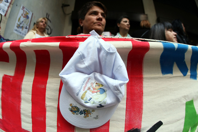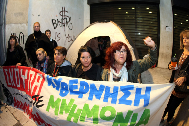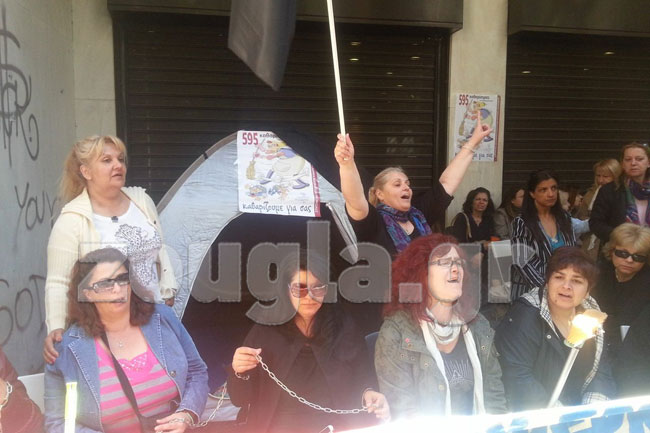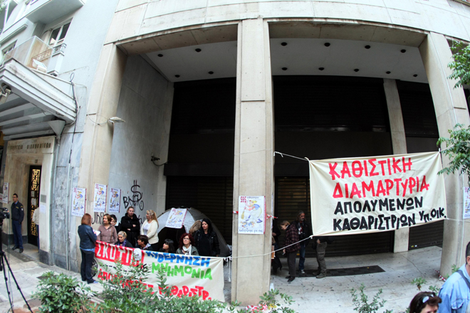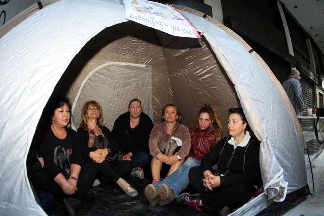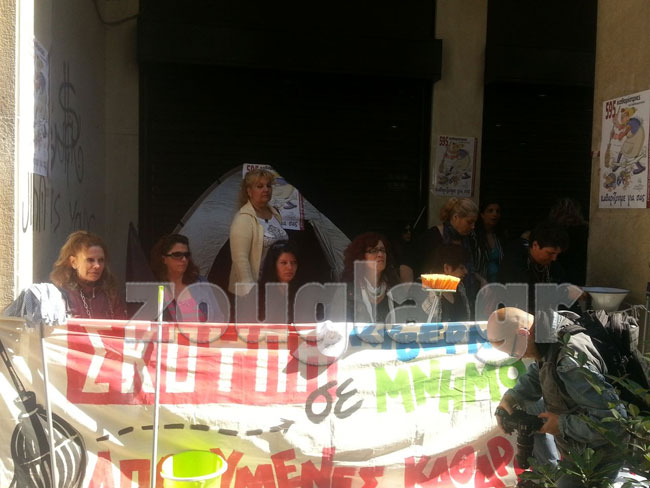 Οι καθαρίστριες του υπουργείου Οικονομικών οι οποίες βρίσκονται αντιμέτωπες με απόλυση αφού στις 18 Μαΐου λήγει το καθεστώς διαθεσιμότητας, διαδηλώνουν έχοντας στήσει αντίσκηνα από τις 06.00 το πρωί και δηλώνουν αποφασισμένες να παραμείνουν εκεί μέχρι να δικαιωθούν, ενώ καλούν σε συμπαράσταση συνδικάτα, ανέργους και νεολαία.