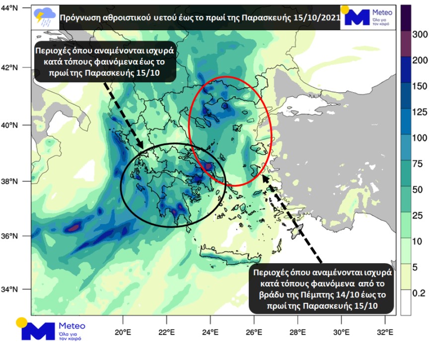 Στον χάρτη που ακολουθεί παρουσιάζονται ο αθροιστικός υετός που αναμένεται έως το πρωί της Παρασκευής καθώς και οι περιοχές των κατά τόπους ισχυρών φαινομένων.