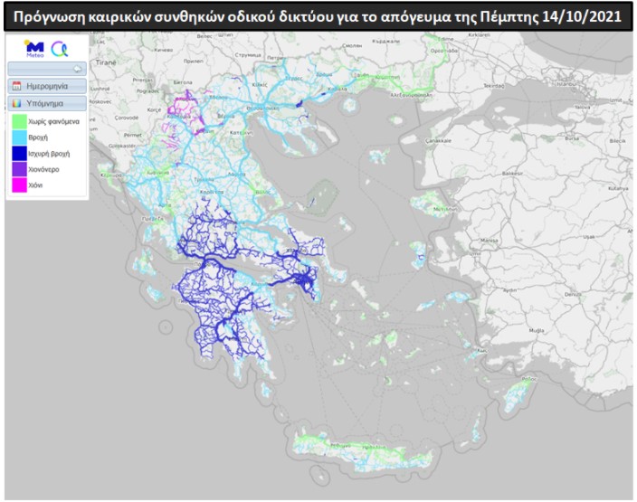 Στον παρακάτω χάρτη φαίνονται ενδεικτικά οι συνθήκες που θα επικρατούν στο οδικό δίκτυο της χώρας το απόγευμα της Πέμπτης.