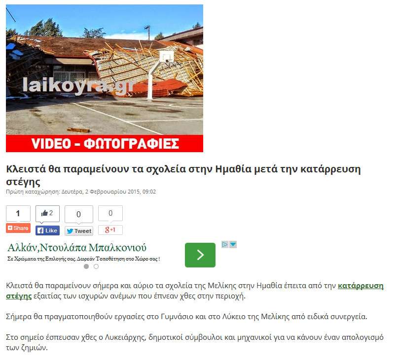Κλειστό θα παραμείνει και σήμερα το Γυμνάσιο και Λύκειο Μελίκης Ημαθίας, η στέγη του οποίου κατέρρευσε την προηγούμενη Κυριακή, χωρίς ευτυχώς να σημειωθούν τραυματισμοί.