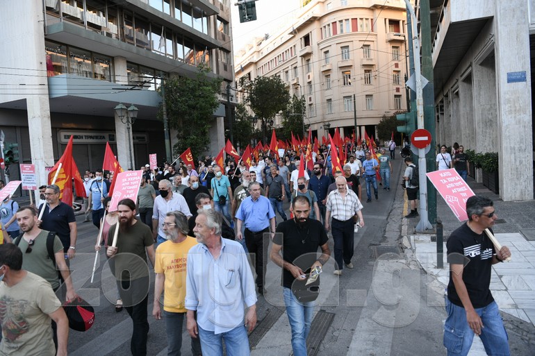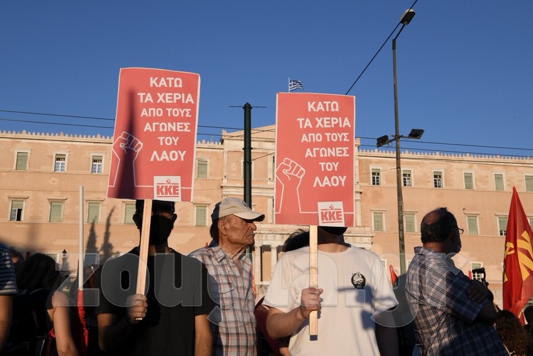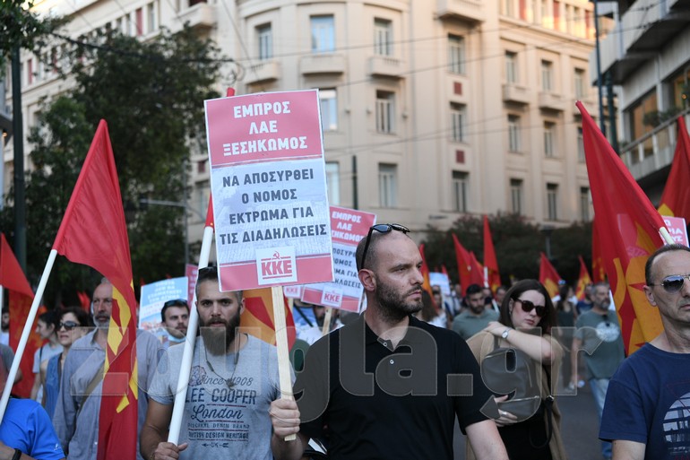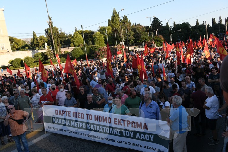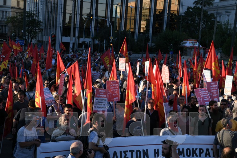 Στις 7.30 μ.μ. είχαν οριστεί οι προσυγκεντρώσεις στην Ομόνοια και στα Προπύλαια. Στη συγκέντρωση δηλώσεις έκανε ο ΓΓ της ΚΕ του ΚΚΕ, Δημήτρης Κουτσούμπας.