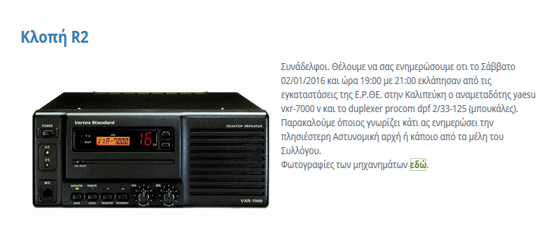 Κάποιοι, είτε κακόβουλα, είτε με σκοπό το κέρδος, ξήλωσαν το Σάββατο 2 Ιανουαρίου –μετά την Καστοριά- τον αναμεταδότη (YAESU VXR7000V) το duplexer (μπουκάλες), (PROCOM DPF 2/33-125) από τις εγκαταστάσεις της ΕΡΘΕ στην Καλλιπεύκη Λάρισας.