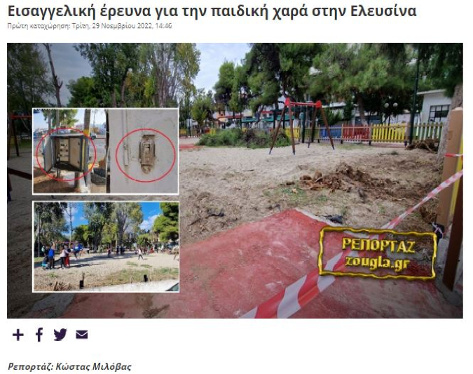 Σύμφωνα με προηγούμενες έρευνες της ηλεκτρονικής εφημερίδας μας zougla.gr έχει αναδειχθεί η αδιαφορία της διοίκησης του δήμου Ελευσίνας για την αποκατάσταση της ασφάλειας των παιδικών χαρών εντός κοινόχρηστων χώρων αρμοδιότητας του δήμου με την Εισαγγελία Πρωτοδικών Αθήνας αυτεπάγγελτα να έχει σχηματίσει έως σήμερα ήδη 3 ποινικές δικογραφίες. Παρόμοια έρευνα είχε δημοσιευθεί και για τις παιδικές χαρές αρμοδιότητας της Κοινωφελούς Επιχείρησης Δήμου Ελευσίνας όπου από τους τρείς χώρους ανακατασκευάστηκε μόνο η παιδική χαρά επί των οδών Κανελλοπούλου και Κοντούλη μετά την αυτεπάγγελτη επέμβαση της Εισαγγελίας Πρωτοδικείου Αθηνών.