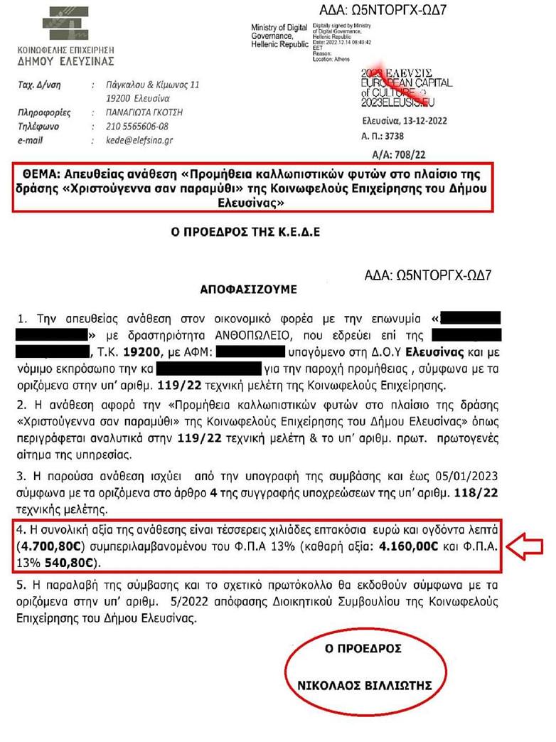 Οι ενδεικτικές δαπάνες που ακολουθούν αφορούν αγορές για κυκλάμινα και άγριες μαργαρίτες συνολικού κόστους προμήθειας 15.542,00 ευρώ (!!!)