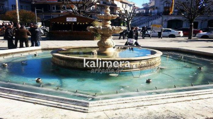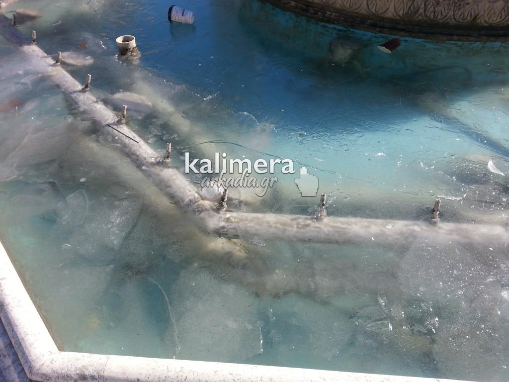 Στην πόλη της Τρίπολης τα πάντα είναι παγωμένα, με πιο χαρακτηριστικό παράδειγμα το σιντριβάνι στην πλατεία Αγίου Βασιλείου.