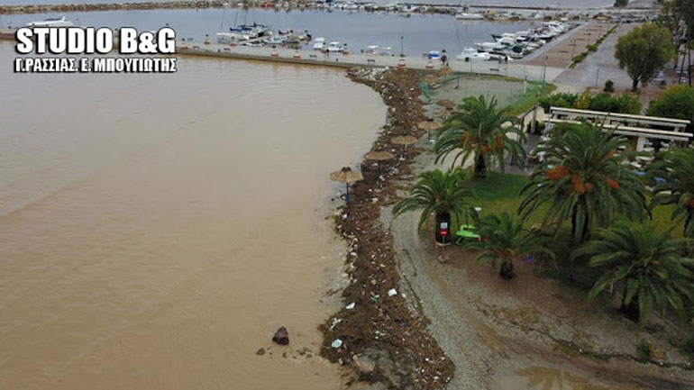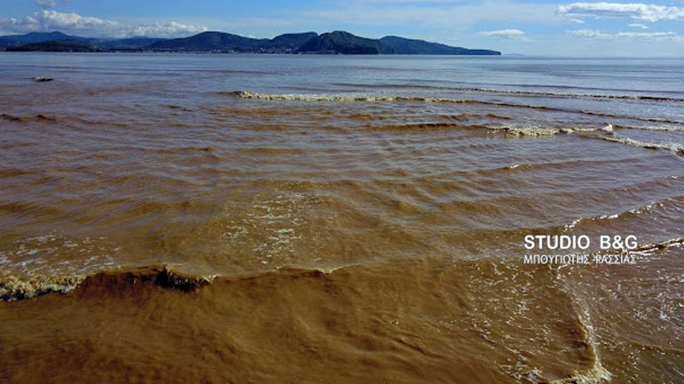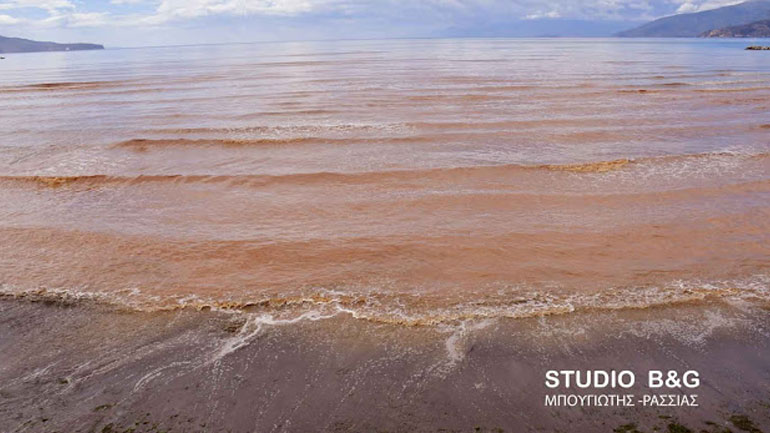 Κοκκίνισε η θάλασσα από τη λάσπη που κατεβάζουν οι χείμαρροι και τα ποτάμια που εκβάλλουν στον Αργολικό κόλπο.