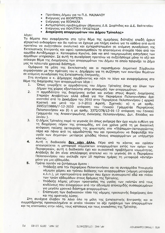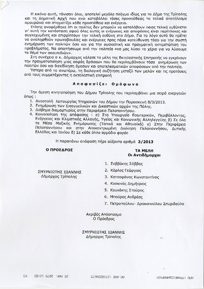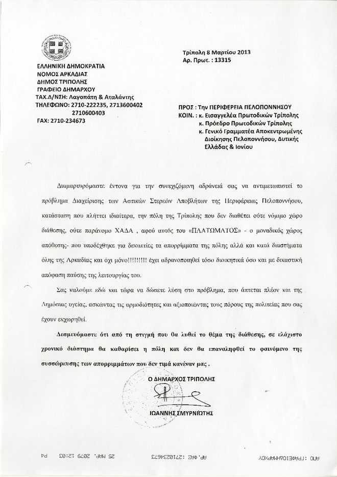 Η zougla.gr επικοινώνησε με τον Δήμαρχο Τρίπολης κ. Γιάννη Σμυρνιώτη όπου μας δήλωσε: «Όπως ξέρετε, δεν υπάρχει ούτε ένας χώρος ΧΑΔΑ στην Πελοπόννησο. Αναγκαστικά τα σκουπίδια μέχρι τον περασμένο Φλεβάρη μεταφέρονταν στην χωματερή Πλάτωμα. Έκλεισε όμως με δικαστική απόφαση. Παράλληλα την αρμοδιότητα την έχει αναλάβει η περιφέρεια από το 2010. Μπορούμε να μαζέψουμε τα σκουπίδια αλλά δεν υπάρχει χώρος για να τα πετάξουμε. Η περιφέρεια έχει λάβει κονδύλι, ύψους 32 εκατομμυρίων ευρώ.